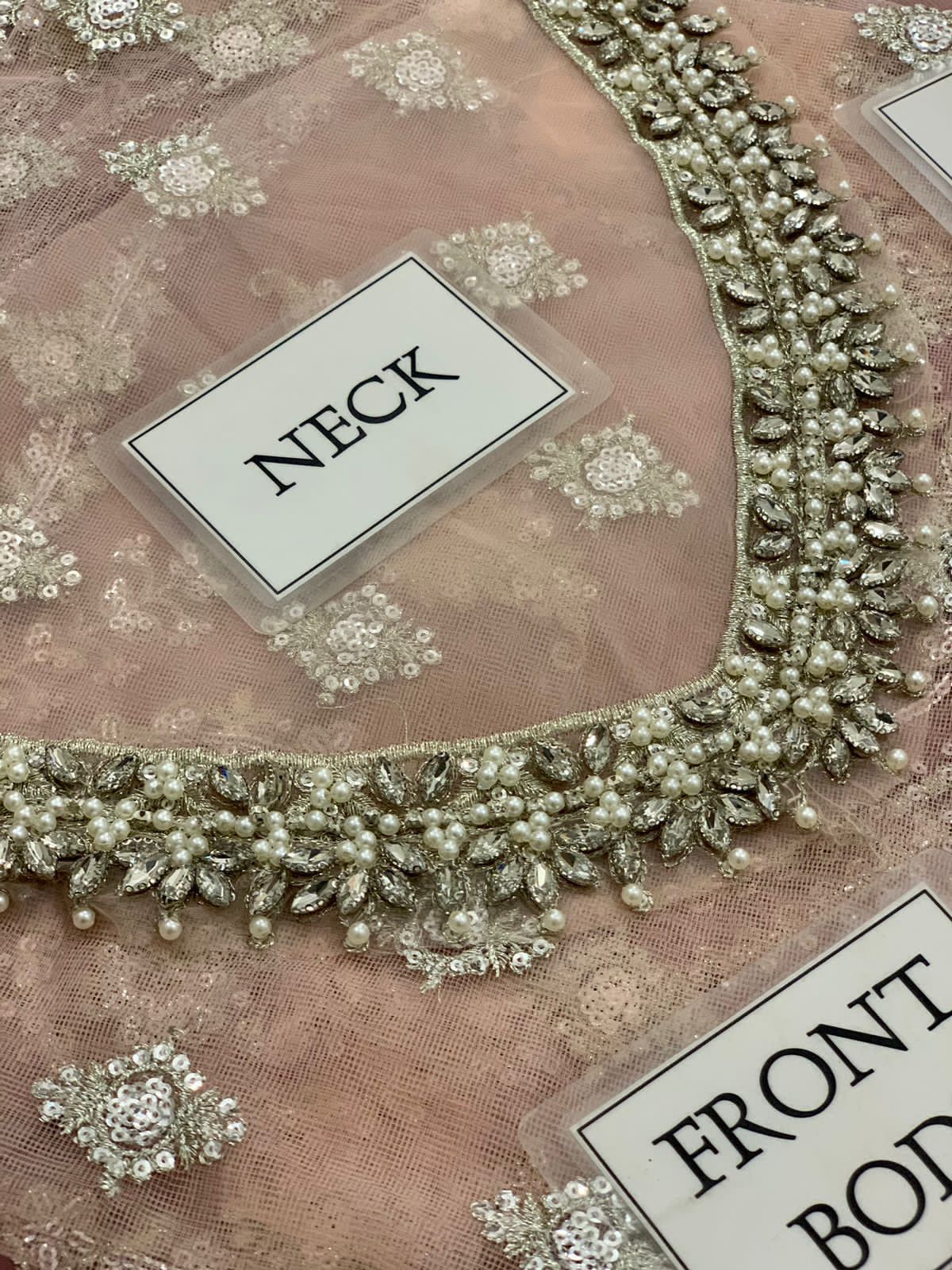 Front Body: Net fully heavy embroidered with spengle work & adda embellished necklace