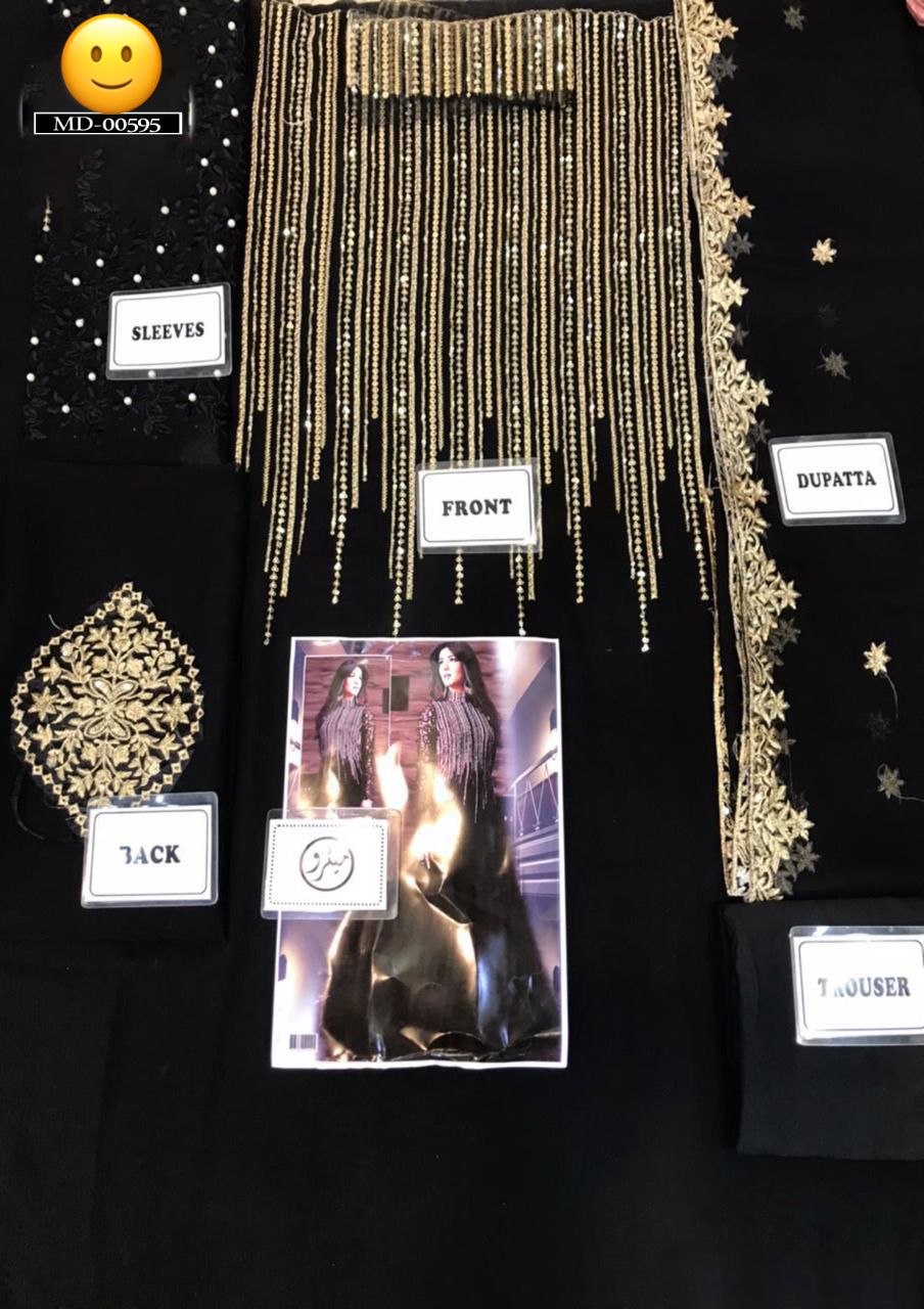 • Details: Heavy Sequence & Zari Embroidered Front, Embroidered Collar Patti, Full Maxi Gher (2.25 Yards), Pearl Hand Work Sleeves, Embroidered Dupatta, Plain Malai Trouser