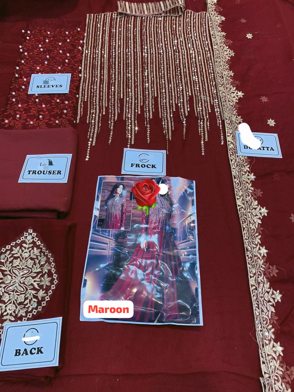 • Details: Heavy Sequence & Zari Embroidered Front, Embroidered Collar Patti, Full Maxi Gher (2.25 Yards), Pearl Hand Work Sleeves, Embroidered Dupatta, Plain Malai Trouser